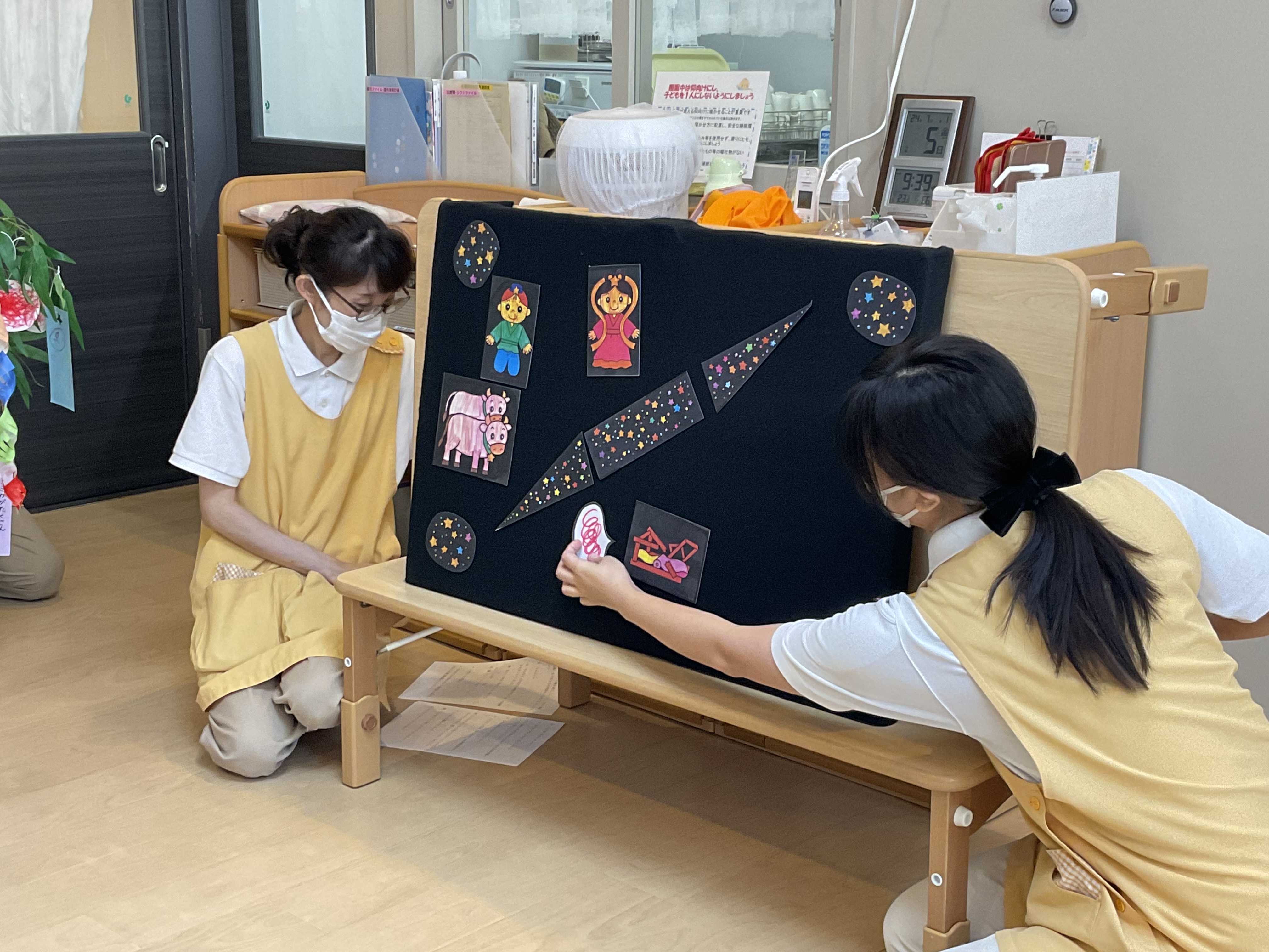 七夕の会をしました🎋 ペープサートを見たり、 製作したトマトや笹飾りを付けた笹を見たり、 願い事を書いた短冊を発表して 飾りました😊 ♪たなばたさま も上手に歌えるようになりました✌️ みんなの願い事が 叶いますように🙏⭐️