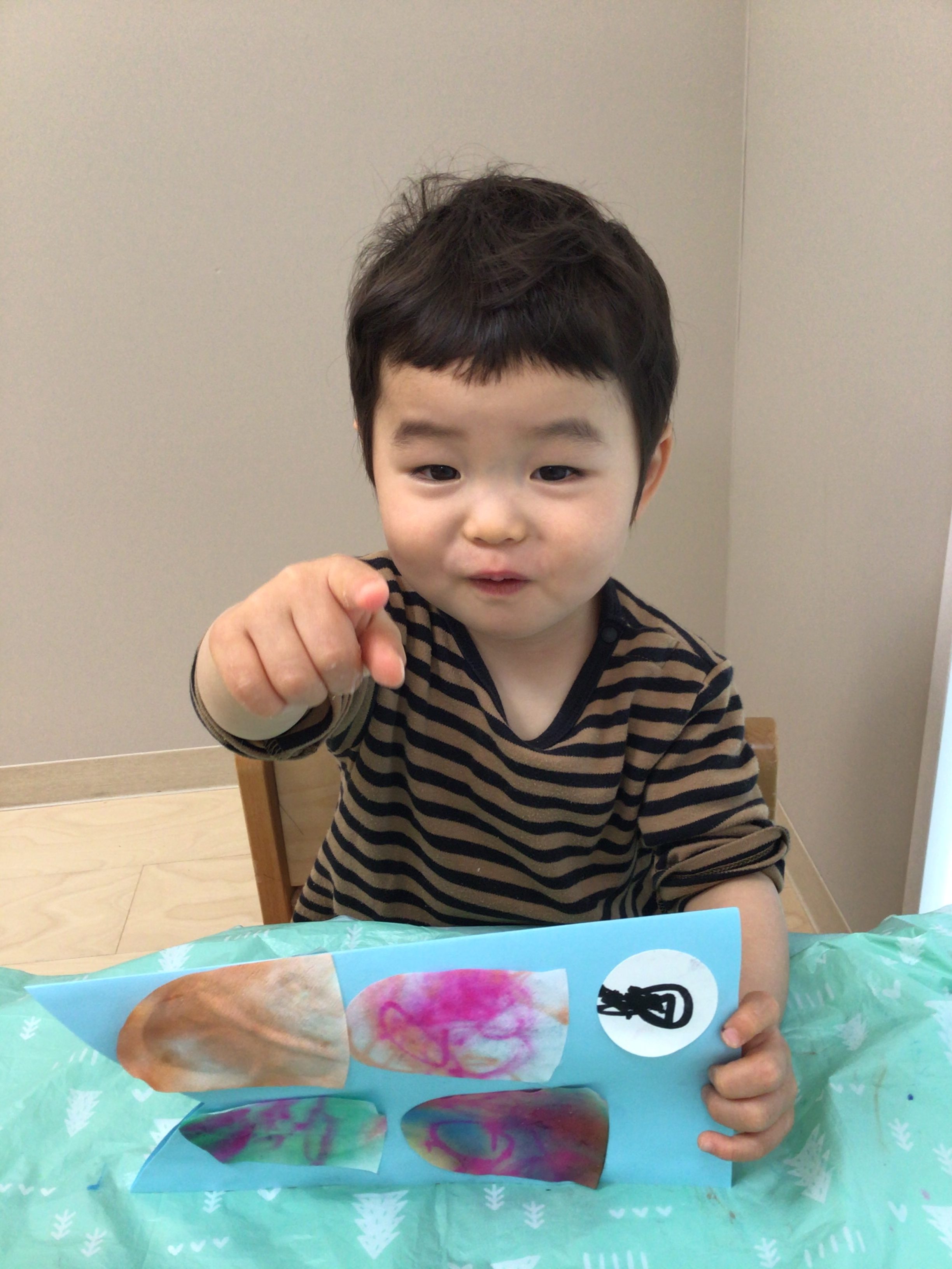 シール貼りをしました😆🤏🏻 指先にシールが張り付いて こいのぼりの台紙に貼る事が 少し難しかったようですが、 何枚か貼るうちにコツを掴み 上手に貼れるようになりました😄